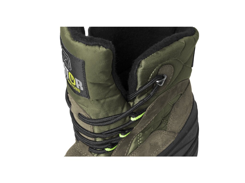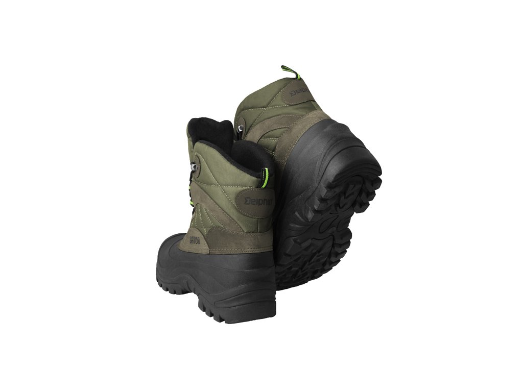 Boty Delphin GATOR jsou určeny na extrémní výpravy zejména v chladnějších obdobích roku. Zvýšený gumový lem podrážky sahá až do výšky kotníků, to znamená, že chůze v loužích, rozbředlém sněhu a blátě není pro GATOR problém. Tato pryžová část se navíc velmi dobře čistí. V zadní části gumové části boty se nachází výstupek, díky kterému si botu bez problémů zujete. Svršek boty je tvořen kombinací odolné nylonové látky a umělé kůže. Tyto materiály dobře odolávají nepřízni počasí a jednoduše se v případě potřeby impregnují. Jazyk boty je přišitý až do výšky 17cm, to znamená, že krátkodobě se můžete pohybovat v takto hlubokých vlhkých oblastech. Šněrování je řešeno přes textilní očka, na vrchu šněrování se nachází jedno kovové oko. Vnitřek boty je tvořen příjemným mikrofleecovým materiálem. O tepelné pohodlí se postará vrstva umělého mikrovlákna mezi vnější a vnitřní vrstvou. Černo-zelenou kombinaci materiálů ocení nejen rybáři, ale i myslivci, turisté a všichni ostatní milovníci přírody. I přes svou mohutnost jsou boty velmi lehké, což jistě přijde vhod při dlouhodobější chůzi. Například obě boty velikosti 43 váží pouze 1200g.