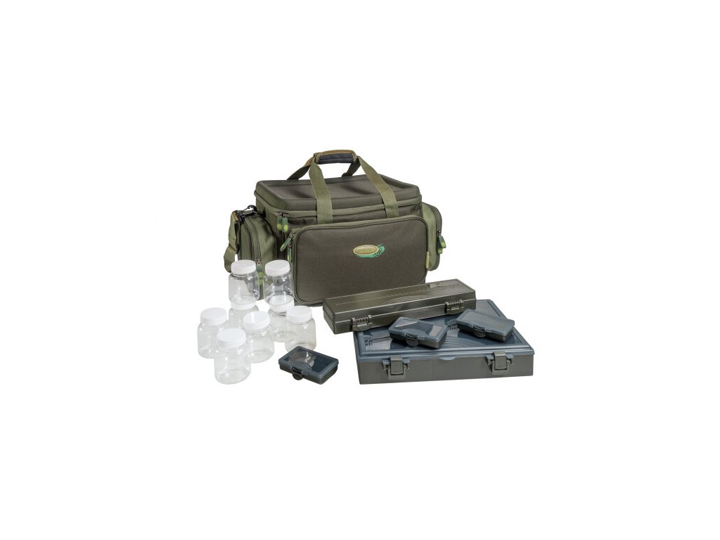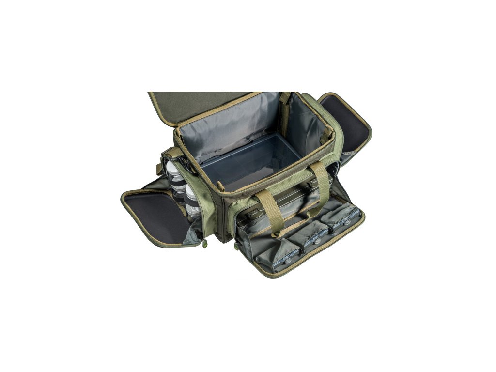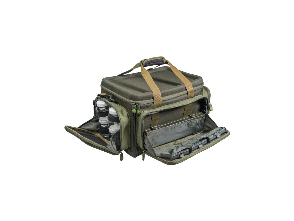 Luxusní objemná taška pro specialisty na lov kaprů s mnoha potřebnými doplňky v základní výbavě. Použitý materiál B-POL600D garantuje dlouhou životnost, omyvatelnost a nepromokavost. Pevné víko se speciálním tvarováním slouží jako stoleček na příslušenství. Nohy stolečku jsou integrované v rozích tašky. Bohatě polstrovaný popruh zajišťuje komfortní přenášení. V ceně tašky je dodáván i dvojitý zásobník na návazce, velká systémová krabice a tři malé krabičky na příslušenství. Vše z nové řady Mivardi Carp Accessories. Dalším doplňkem tašky je osm kvalitních dóz na dipy s důkladně těsnícím uzávěrem.