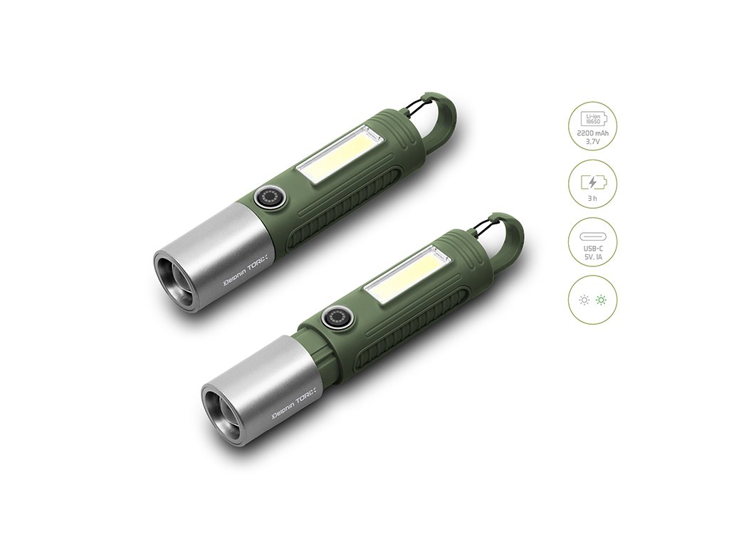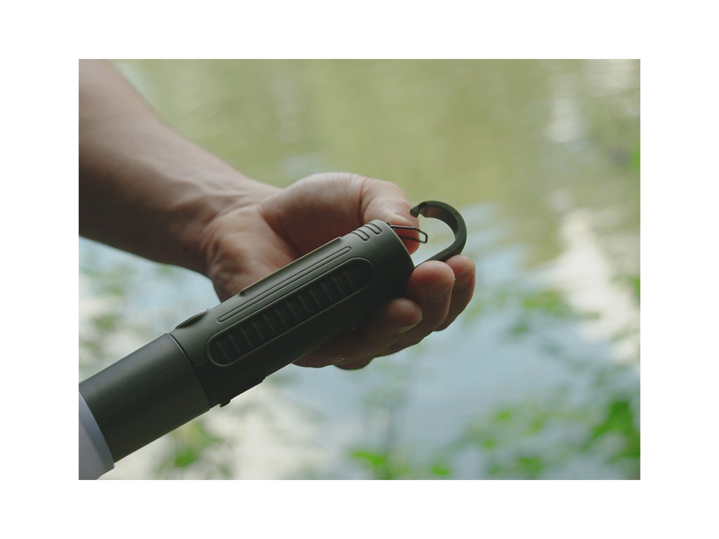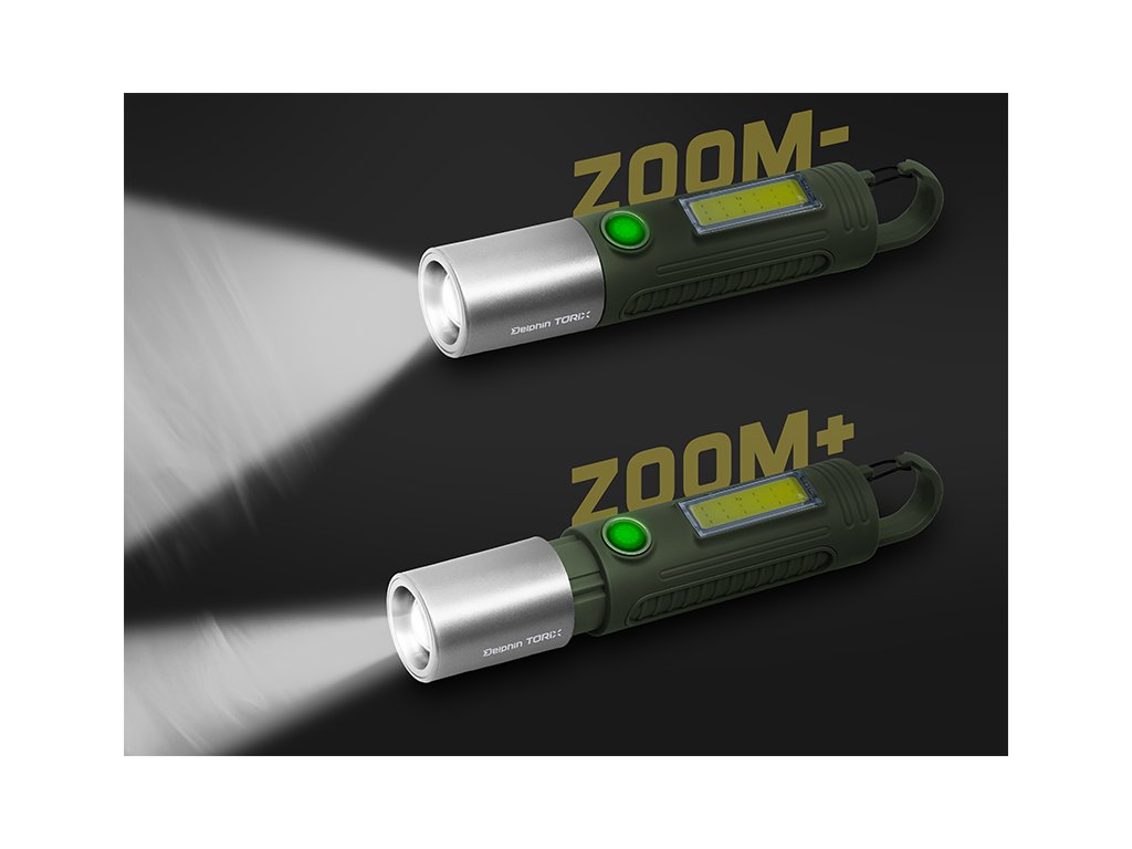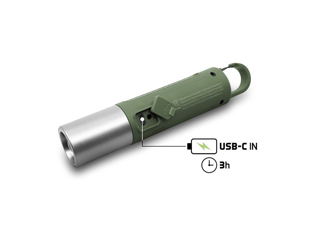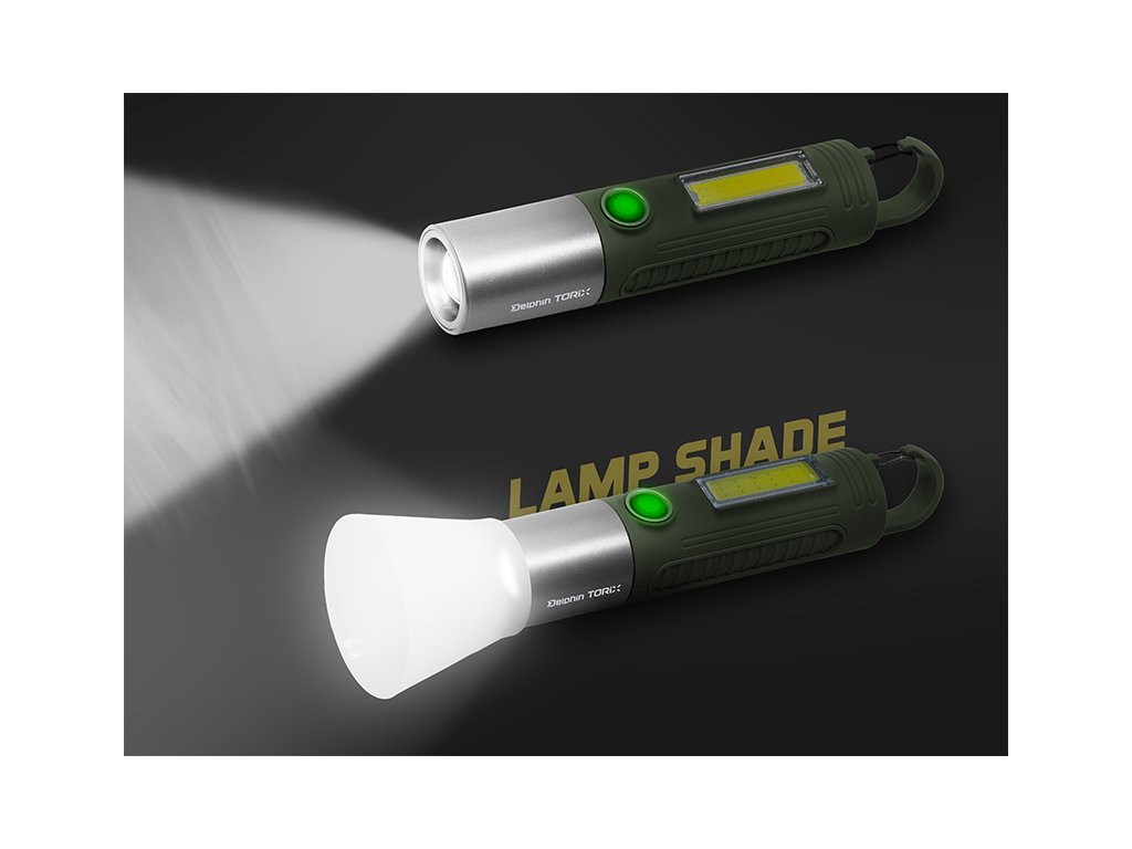 Delphin Torix je praktická nabíjecí svítilna s univerzálním využitím. Můžete jej použít jako klasickou baterku, lampu do bivaku nebo jako spolehlivého pomocníka při nočním nahazování – zejména díky funkci ZOOM, která umožňuje přizpůsobit šířku světelného kužele přesně podle potřeby. Svítilna je vybavena dvěma LED diodami s možností přepínání mezi bílým a zeleným světlem. Ovládání probíhá prostřednictvím spínacího tlačítka, které se nachází přímo na těle svítidla. Prvním stisknutím se aktivuje hlavní dioda s funkcí ZOOM a 100% intenzitou svícení (140 lumenů), přičemž výdrž baterie v tomto režimu je přibližně 5 hodin. Druhý stisk sníží intenzitu světla na 50 % (70 lumenů). Třetím kliknutím se zapne druhá dioda s bílým světlem a plnou intenzitou 170 lumenů, ve které svítilna vydrží fungovat přibližně 5 hodin. Čtvrtým stisknutím se aktivuje zelené světlo, ideální například jako poziční osvětlení – jeho výdrž dosahuje až 24 hodin. Mezi největší přednosti svítidla Delphin Torix patří právě funkce ZOOM. Pomocí výsuvné části můžete snadno přiblížit nebo oddálit čočku, čímž upravíte šířku světelného kužele – od širokého rozptýleného svitu až po úzký koncentrovaný paprsek, ideální například pro noční nahazování. V balení se nachází také praktické stínítko, které jednoduše nasadíte na reflektor. Díky němu se ze světelného paprsku stane příjemně rozptýlené osvětlení, ideální do bivaku či stanu. Kuželovitý tvar stínítka navíc zajišťuje stabilitu při postavení na rovný povrch. Na vrchní části se nachází háček, který umožňuje snadné zavěšení - například za ouško v bivaku nebo na větev. Delphin Torix je napájen zabudovaným akumulátorem typu 18650 s kapacitou 2200 mAh. Nabíjení probíhá pomocí USB-C kabelu, který se také nachází v balení. Úplné nabití trvá přibližně 3 hodiny. Stav nabití lze průběžně sledovat pomocí spínacího tlačítka, které má na sobě indikátor stavu baterie. Tělo svítidla je navrženo tak, aby odolávalo běžnému mechanickému opotřebení, ale i vnějším vlivům. Delphin Torix je spolehlivá, kompaktní svítilna, na kterou se můžete spolehnout za každých okolností. Technické parametry: Rozměry: 17x3cm Režimy svícení: Hlavní LED dioda – bílé světlo (100%-5h, 50%-7h), druhá LED dioda – bílé světlo 100%-5h, zelené světlo 100%-24h Napájení: Li-Ion zabudovaný akumulátor typ 18650, 2200mAh 3.7V Světelný výkon: 170 lm Nabíjení: USB-C (pomocí přiloženého kabelu)