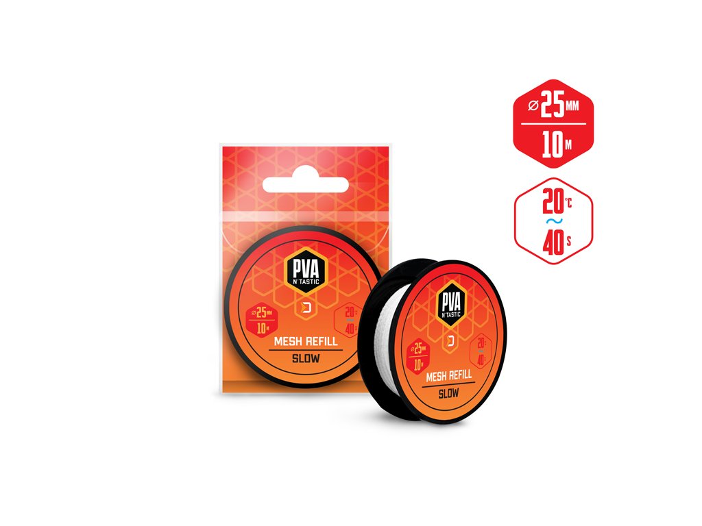 Jedná se o vysoce kvalitní produkt vyrobený v EU, při kterém díky důkladnému pletení nedochází ke svévolnému trhání punčochy a zároveň se výborně plní i velmi jemnými částicemi, čímž budete moci spolu s nástrahou poslat do vody i maximálně atraktivní návnadu přímo na montáži. PVA punčocha se po čase přímo úměrném teplotě vody rozpustí, a tak uvolní krmnou směs v bezprostřední blízkosti nástrahy, čímž výrazně zvýší její atraktivnost pro kaprovité ryby. Upozornění: PVA produkty jsou vodou rozpustné, manipulujte s nimi proto jen se suchýma rukama, aby nedošlo k jejich deformaci či poškození. Technické parametry: Průměr: 25mm(úzká) Délka: 10m Doba rozpustnosti: cca 40s/20°C voda