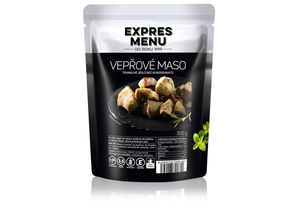 Kousky vepřové plece dušené doměkka ve vlastní šťávě, dochucené jen solí.