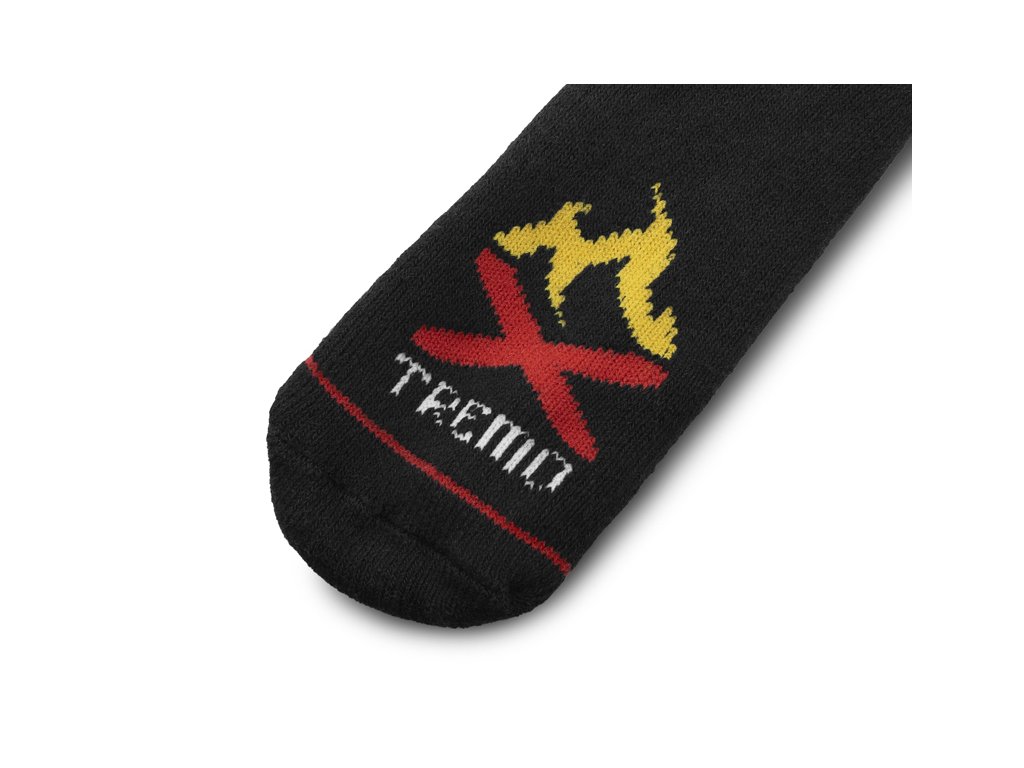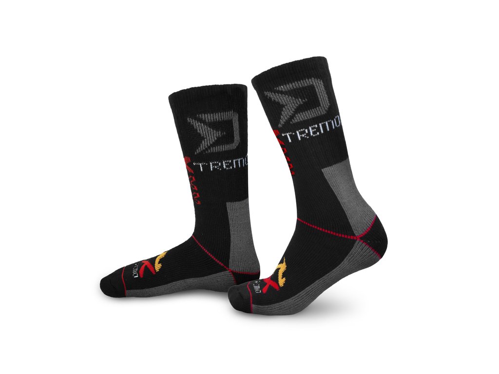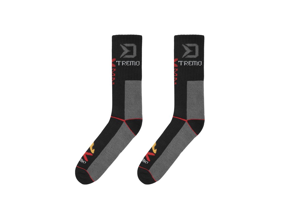 Extra teplé termo ponožky určené pro použití při teplotách hluboko pod nulou během zimních měsíců. Použitá tkanina má vysokou gramáž, skvělé termoizolační vlastnosti a je mimořádně pružná, díky čemuž se velmi dobře přizpůsobí a natáhne na nohu. Ve vrchní části se nachází gumička určená pro lepší obepnutí a zafixování v požadované výšce. Design ponožek XTREMO je vytvořen kombinací černé a šedé barvy s oranžovou grafikou ohně, červenými a bílými prvky doplněnými velkým šedým logem Delphin. Dodáváme je ve třech rozměrech se širokým rozpětím velikostí, díky čemuž si každý vybere pro sebe tu ideální. Technické parametry: Materiálové složení: 85% bavlna, 10% elastan, 5% polyester